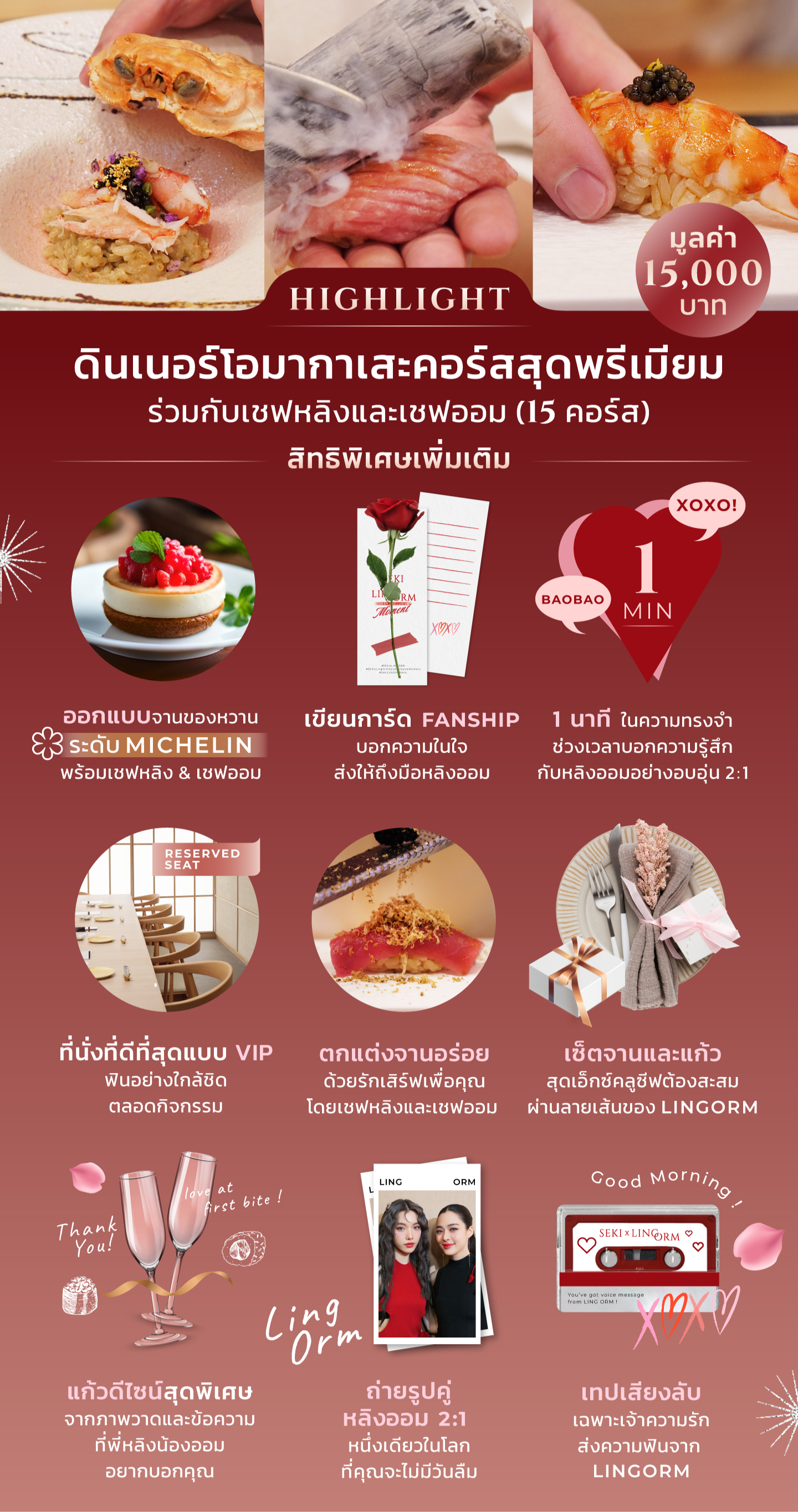 พิเศษกว่าใคร !! สำหรับ 3 ท่านที่มียอดใช้จ่ายสูงสุด ได้รับเชิญร่วมดีไซน์ของหวานจานพิเศษที่คิดค้นโดยเชฟ Michelin Star ระดับ 3 ดาว เติมความรักให้ทุกจานในเเบบของคุณเองอย่างใกล้ชิดที่สุดของที่สุดร่วมกับ “เชฟหลิง & เชฟออม” ครั้งเเรกสุดฟินกับดินเนอร์ในฝันที่ไม่เคยมีมาก่อน